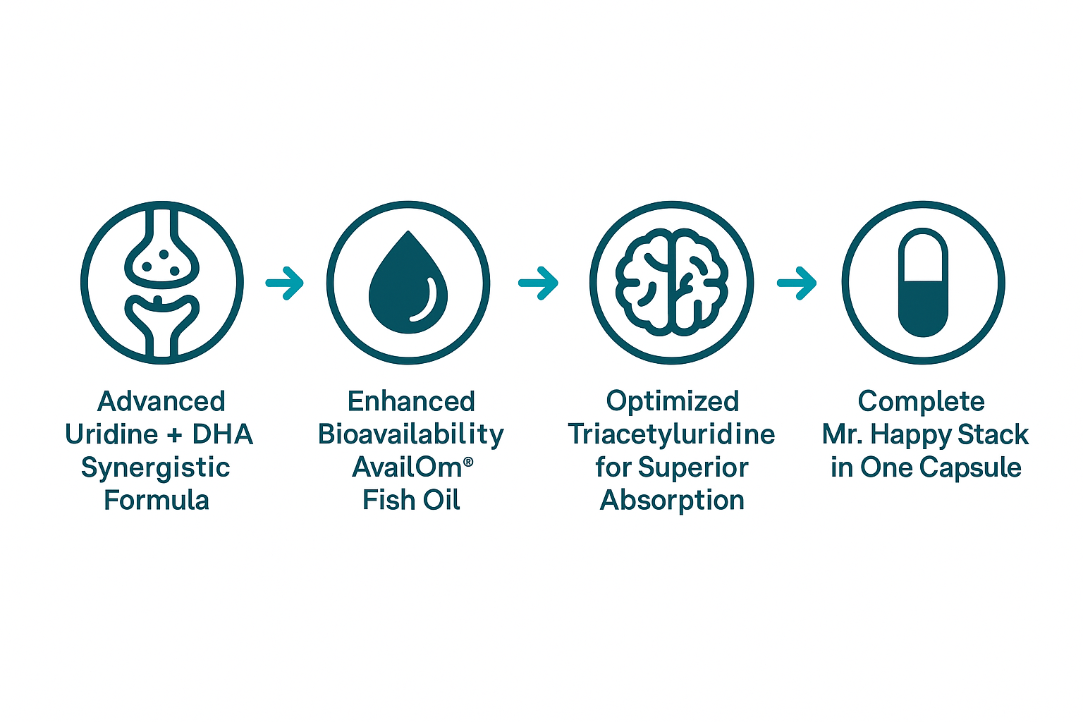 We've been longtime users of the legendary "Mr. Happy Stack" that originated in online nootropics communities back in 2011, combining DHA from fish oil with uridine for cognitive benefits. The challenge was always having to source multiple supplements from different vendors and manage complex dosing schedules. We wanted to create a comprehensive, convenient version that improved upon the original formula while maintaining its effectiveness.